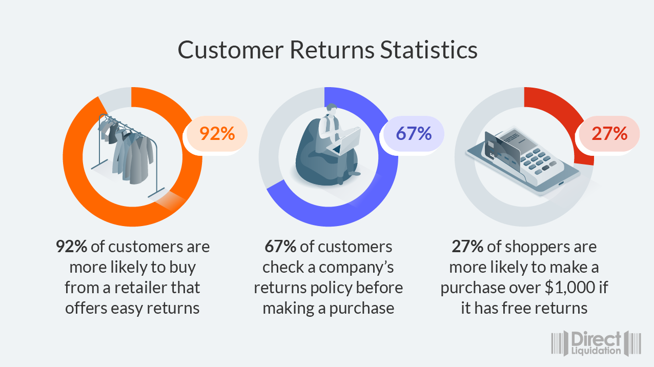 There are good reasons why online retailers offer such generous returns policies. Research has found that 92% of customers are more likely to buy from a retailer if they make returns as easy as possible. 67% of customers are also more likely to check a company’s returns policy before making a purchase, and 27% of shoppers are more likely to make a purchase over $1000 if a company offers a free returns policy. On top of all that, 62% of shoppers are more likely to purchase if they can return an item bought online to a physical store.