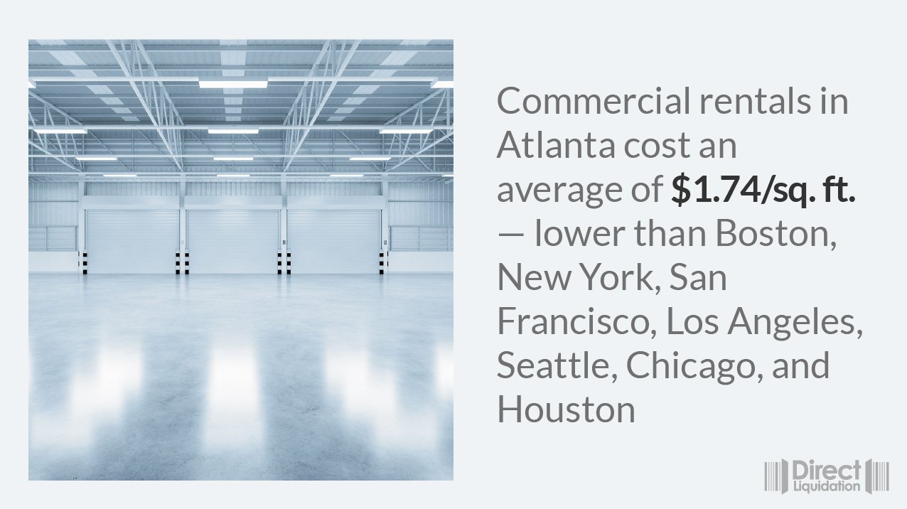 151 14th St NW, Atlanta, GA 30318, United States https://www.spaceshopselfstorage.com/locations/georgia/atlanta/space-shop-self-storage-14th-street/ Pricing 5’x5’: $52 /month 10’x10’: $225 /month 10’x20’: $400 /month Atlanta is a city with a lot of wealth, the busiest airport in the country, and a large student population. Atlanta offers generous grants, networking events, and workshops to help small businesses grow. Looking beyond the wealth - Atlanta is a city with deep income inequality, student poverty, and a stark lack of access to retail; the city is ideally placed to start a business reselling discount merchandise. Buying liquidation pallets in Atlanta is easy because the city is a major regional hub for transport, logistics, and retail distribution producing a large quantity of surplus inventory.