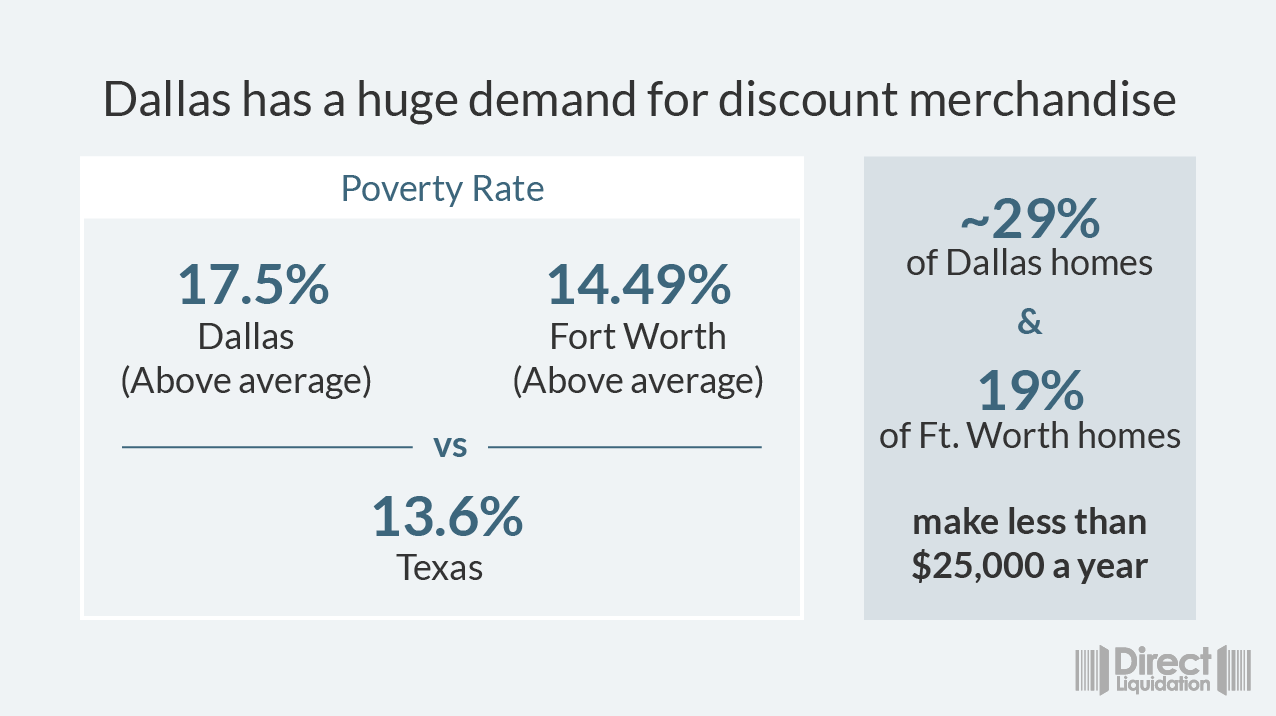 When buying liquidation pallets in Dallas - Fort Worth, you need space to store merchandise. If you’re just starting out, it’s best to use a spare room or garage to minimize costs. If you need more space but aren’t ready for a full warehouse, you’ll be happy to know there are plenty of storage units in the area. We’ve listed 5 of the least expensive: Peyton`s Place Self Storage 562 W Lawson Rd, Dallas, TX 75253, United States https://www.peytonsplaceselfstorage.com/ Pricing 5’x5’: $39 /month 10’x10’: $95 /month 10’x20’: $155 /month Extra Space Storage 4114 N Central Expy, Dallas, TX 75204, United States https://www.extraspace.com/storage/facilities/us/texas/dallas/501700/?cid=org%3A%3Amaps Pricing 5’x5’: $45 /month 10’x10’: $126 /month 10’x20’: $396 /month Macho Self Storage Dallas 1750 W Northwest Hwy, Dallas, TX 75220, United States https://machostorage.com/ Pricing 5’x5’: $52 /month 10’x10’: /month 10’x20’: $162 /month Public Storage 2420 N Haskell Ave., Dallas, TX 75204, United States https://www.extraspace.com/storage/facilities/us/texas/dallas/501700/?cid=org%3A%3Amaps Pricing 5’x5’: $71 /month 10’x10’: $199 /month 10’x20’: $293 /month Deep Ellum Self Storage 3215 Hickory St, Dallas, TX 75226, United States https://www.deepellumss.com/ Pricing 5’x5’: /month 10’x10’: $150 /month 10’x20’: $209 /month The Dallas - Fort Worth metropolitan area is a huge market of more than 7.63 million people, a huge number of students, and a large transient population. On top of this, there are many economically depressed areas with hundreds of thousands of families looking for discounted goods. Also, as a huge shopping hub, the metroplex has a large amount of surplus merchandise for sale. These factors add together a great environment to start buying liquidation pallets in Dallas - Fort Worth to resell.