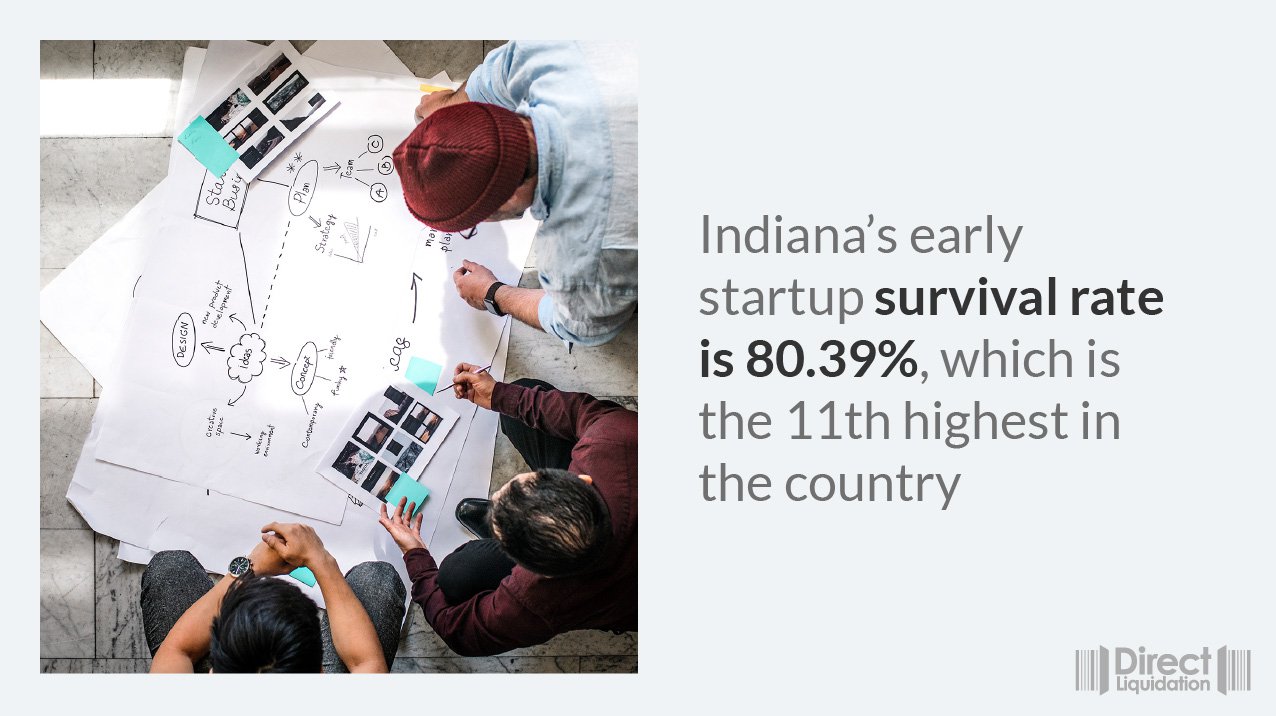 - Indiana’s early startup survival rate is 80.39%, which is the 11th highest in the country.