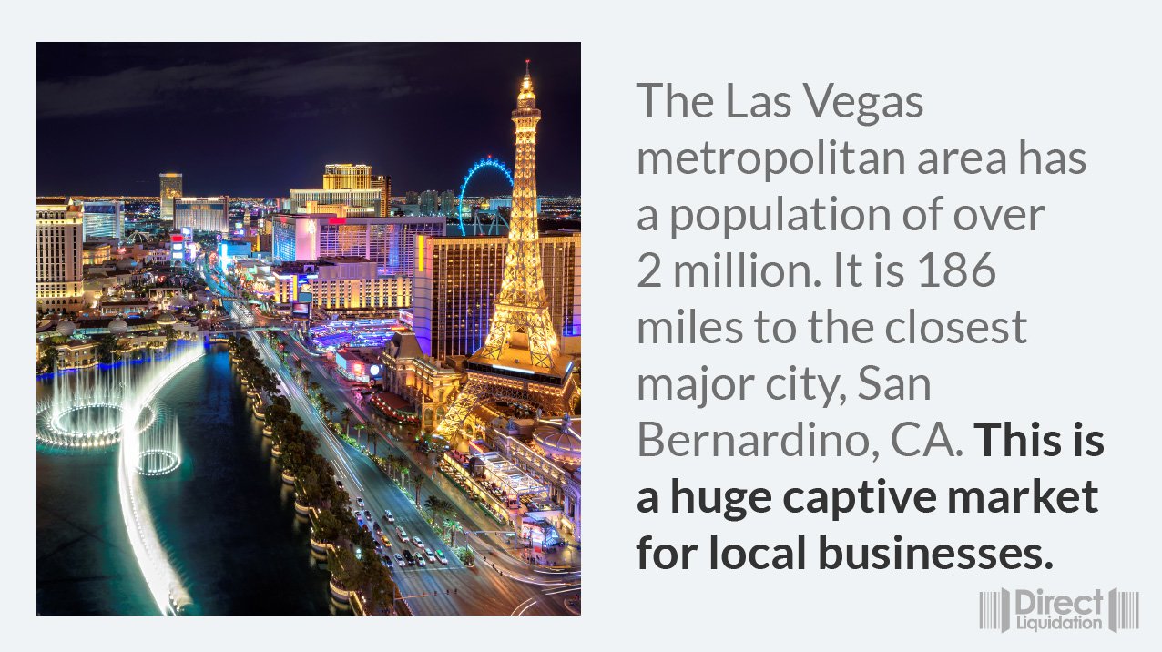 As of the 2010 United States Census, there were 1,951,269 people, 715,365 households, and 467,916 families in the county. The Las Vegas Valley remains one of the fastest growing metropolitan areas in the United States, and about 8.7% of families and 11.7% of the population were below the poverty line, including 16.9% of those under age 18 and 7.6% of those age 65 or over. These numbers help strengthen the market for discounted merchandise. The Las Vegas metropolitan area has a population of over 2 million. It is 186 miles to the closest major city, San Bernardino, CA. This is a huge captive market for local businesses. Total incomes in Las Vegas are 11% lower than the national average. As a result, the climate for discount stores, and reduced-price merchandise, is favorable. In 2021, based on projections from The National Retail Federation, Las Vegas area consumers were expected to spend more than $30.1 billion on retail this year, a 6.5% increase versus 2020. Apart from the captive market of over 2 million people, with no alternative major city close by, Las Vegas also brings in huge numbers of tourists and business people, especially to conferences. For the first seven months of 2021, Las Vegas welcomed about 16.8 million visitors, and 19 million visitors in 2020 - despite the pandemic. This makes the city one of the largest in the world in terms of transient populations - a huge throughput of visitors every day who do not stay there for long. Many people in this population can be potential customers, but the market is not the only thing to help you start a low-cost business in Las Vegas.Benefits to Starting a Liquidation Business in Las Vegas