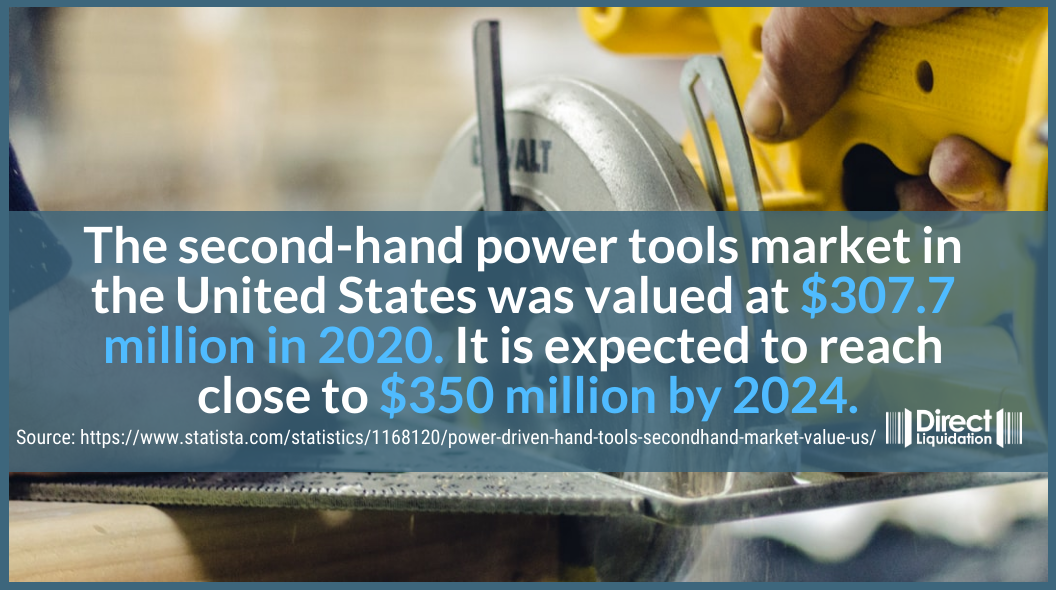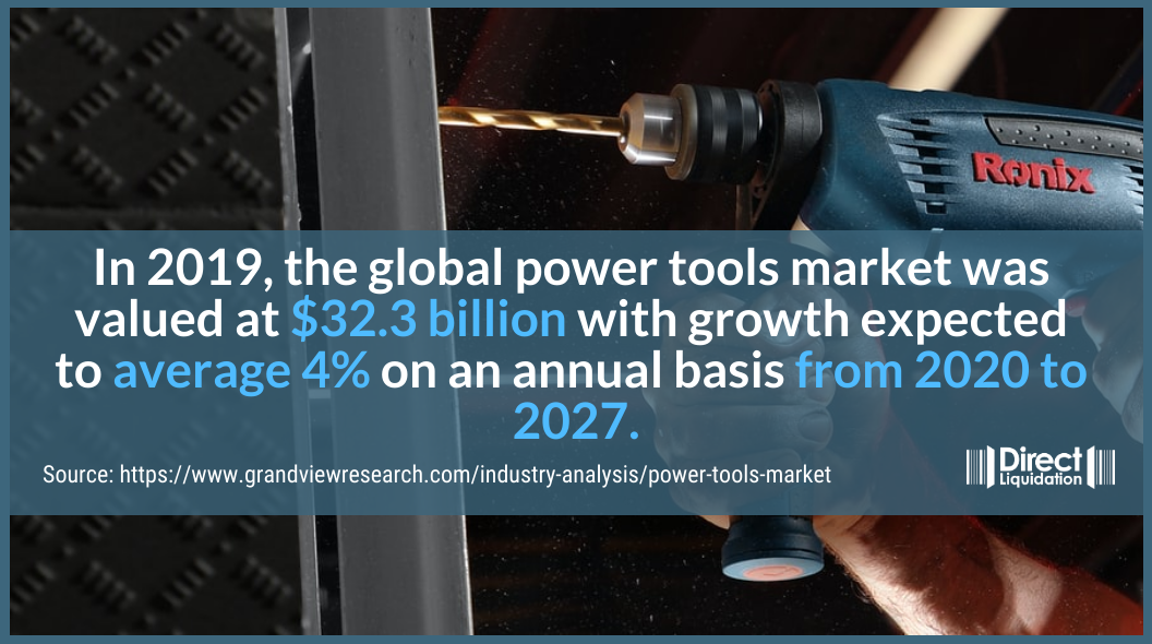 In 2019, the global power tools market was valued at $32.3 billion with growth expected to average 4% on an annual basis from 2020 to 2027. The rise stems from the automotive and construction industries, which involve tasks and jobs that require power tools. The use of power tools is also growing in popularity in the do-it-yourself (DIY) community. Household users are looking to complete tasks as easily and as efficiently as possible. Manufacturers keep finding new ways of making their products more user-friendly and efficient, which makes these home projects more approachable. This constant technological advancement also motivates avid users and professionals to renew their toolboxes, which equates to a growing supply of used power tools up for sale. There is often an excess of used power tools caused by lenient returns policies that mean the retailer takes back the items even when they are obviously used or damaged. It is also not unusual that professionals with large sets of tools trade them in to retailers through loyalty programs or in part exchange for a set of new power tools. This leaves retailers like Walmart or Lowe’s with a significant amount of used tools that they have to find new homes for. These items are usually liquidated or sold to the secondary market through liquidation platforms.