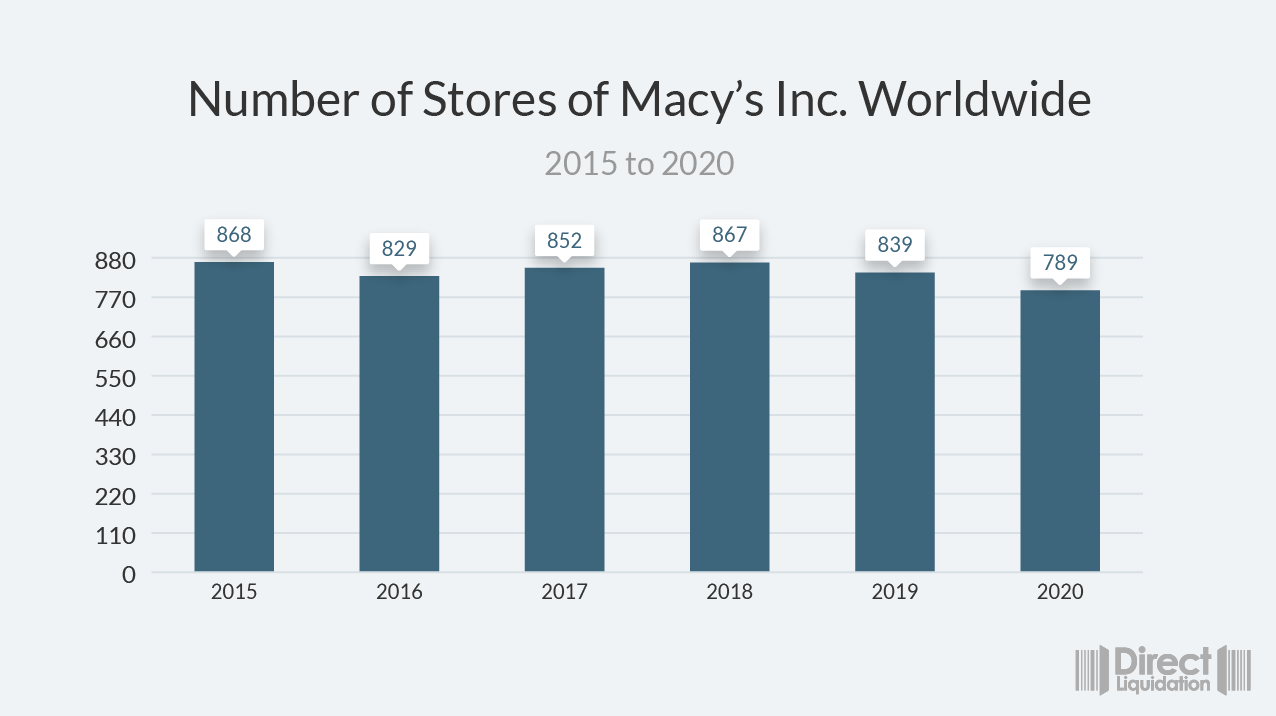 - Macy’s currently operates out of 732 locations worldwide (2020) and employs around 90,000 people.