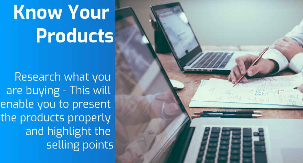 - Research the market: there is no point in buying products to then try to sell them in a saturated market unless you can undercut the competition.