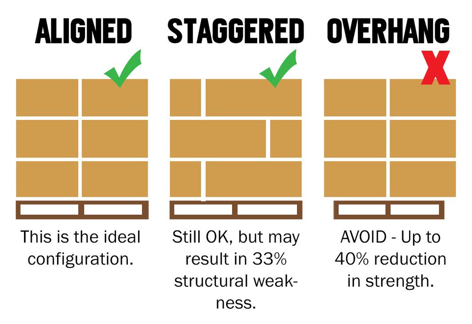When it comes time to stack your boxes of merchandise onto pallets, it’s important to make sure they are packed as best as possible. Try to avoid overhanging and staggering (where possible) as this can reduce the load-bearing capacity of the lower boxes by up to 40%. Staggering is often unavoidable, but do be aware that it may reduce the load’s structural integrity by as much as 33% during transit. Please see below for the ideal way to stack your pallets of merchandise.